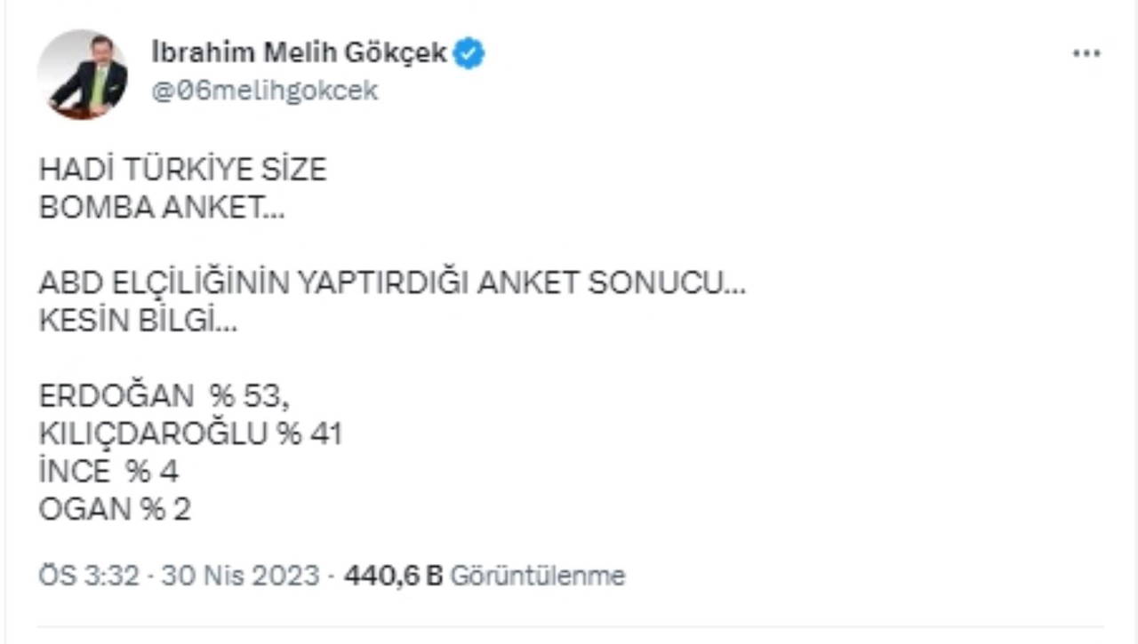 Anketi yaptıran ise Gökçek'in iddiasına göre ABD Büyükelçiliği oldu. Gökçek'in "Hadi Türkiye size bomba anket... Kesin bilgi" diyerek paylaştığı anket sonucuna göre Erdoğan yüzde 53 oy oranıyla seçimi kazanırken Kılıçdaroğlu ise yüzde 41'de kalıyor.