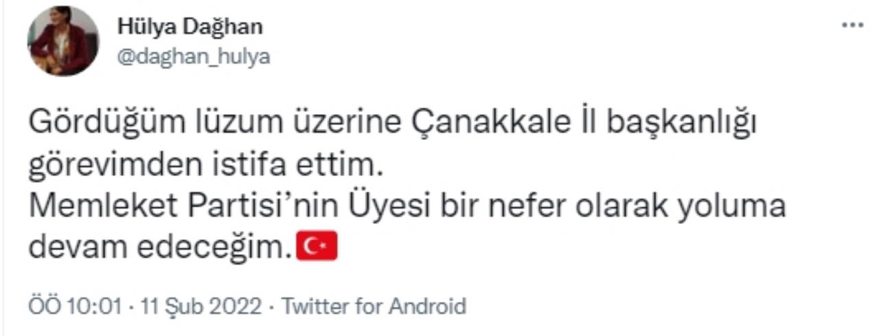 Memleket Partisi Çanakkale İl Başkanı Hülya Dağhan da görevinden istifa ettiğini açıkladı.