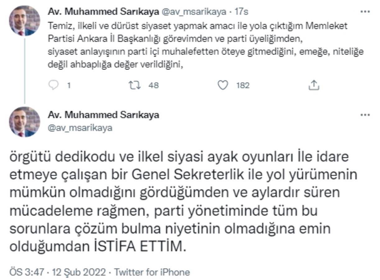 “Temiz, ilkeli ve dürüst siyaset yapmak amacı ile yola çıktığım Memleket Partisi Ankara İl Başkanlığı görevimden ve parti üyeliğimden, siyaset anlayışının parti içi muhalefetten öteye gitmediğini, emeğe, niteliğe değil ahbaplığa değer verildiğini, örgütü dedikodu ve ilkel siyasi ayak oyunları ile idare etmeye çalışan bir Genel Sekreterlik ile yol yürümenin mümkün olmadığını gördüğümden ve aylardır süren mücadeleme rağmen, parti yönetiminde tüm bu sorunlara çözüm bulma niyetinin olmadığına emin olduğumdan istifa ettim”