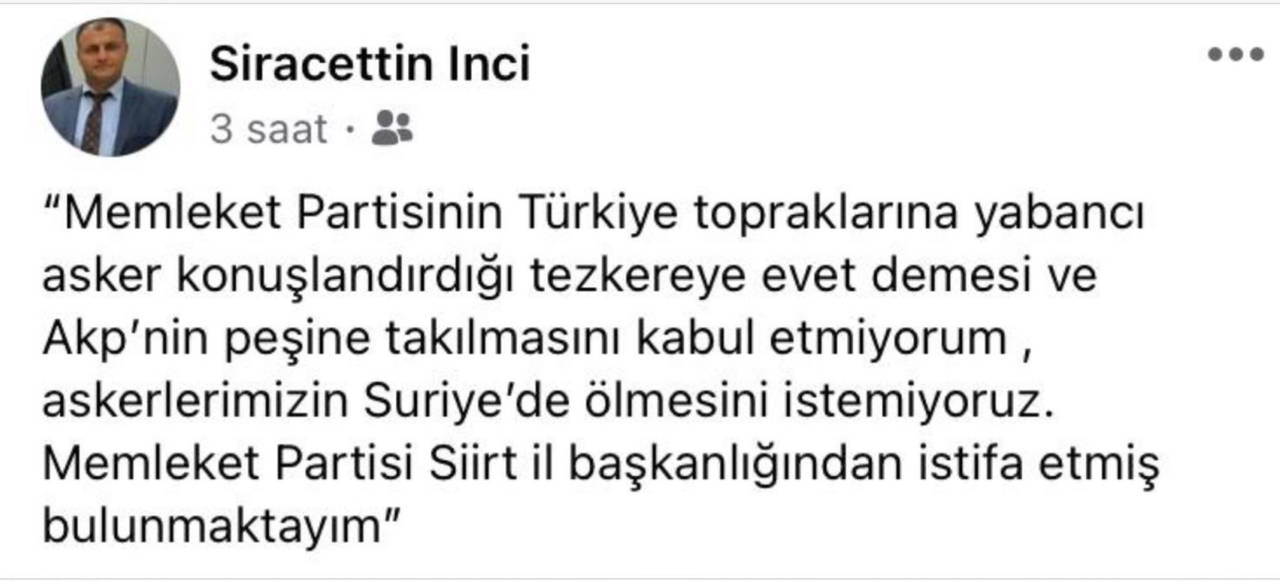 "Memleket Partisi'nin, Türkiye topraklarına yabancı asker konuşlandırıldığı tezkereye 'evet' denmesi ve AKP'nin peşine takılmasını kabul etmiyorum, askerlerimizin Suriye'de ölmesini istemiyoruz. Memleket Partisi Siirt İl Başkanlığı'ndan istifa etmiş bulunmaktayım."