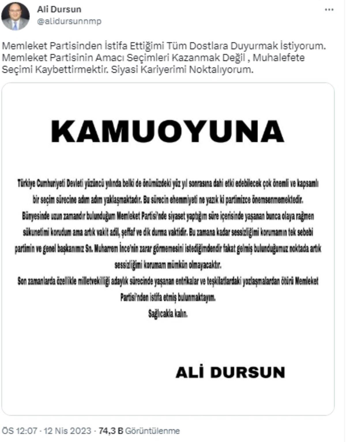 Muharrem İnce liderliğindeki Memleket Partisi'nin kurucu üyelerinden Ali Dursun adına açılmış bir sosyal medya hesabından istifa açıklaması yapıldı.