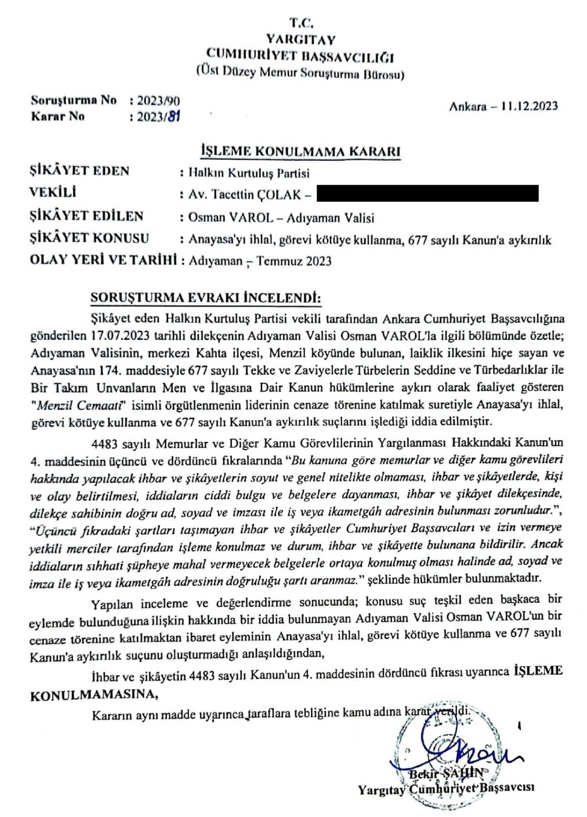 Yargıtay Cumhuriyet Başsavcısının, anayasayı ve yasaları hiçe sayan bu fiiller karşısında kayıtsız kalması ve suç duyurularımızı yasal dayanaktan yoksun bir şekilde işleme koymaması keyfi ve kanunsuzdur. Kendisi açısından sorumluluk doğurur. Bu karar, Diyarbakır’daki bir caddeye Şeyh Sait adını veren kayyım valinin yaptığı ile Meclis kürsüsünden yılan yuvası cemaat ve tarikatlara STK diyen Ortaçağ’cı meczup Milli Eğitim Bakanı Yusuf Tekin’in cumhuriyet ve laiklik düşmanı hezeyanlarla aynı türden bir harekettir.”