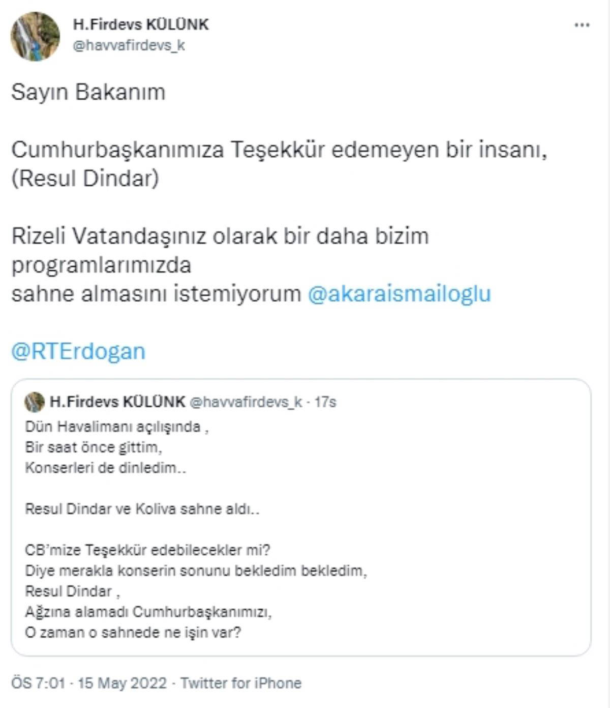 Külünk'ün şikayet konusu ise Resul Dindar'ın konserinde "AKP'li Cumhurbaşkanı Recep Tayyip Erdoğan'a teşekkür etmemesi" oldu. Külünk, Twitter hesabından Bakan Karaismailoğlu'nu etiketleyerek şöyle yazdı: