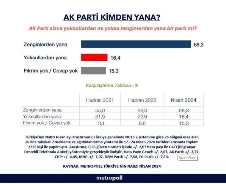 17-24 Nisan tarihleri arasında ve Türkiye genelinde 28 ilde toplam 2235 kişiyle yapılan araştırmanın sonuçlarına göre, ankette katılımcılara "AK Parti sizce yoksullardan mı yoksa zenginlerden yana bir parti mi?" diye soruldu.