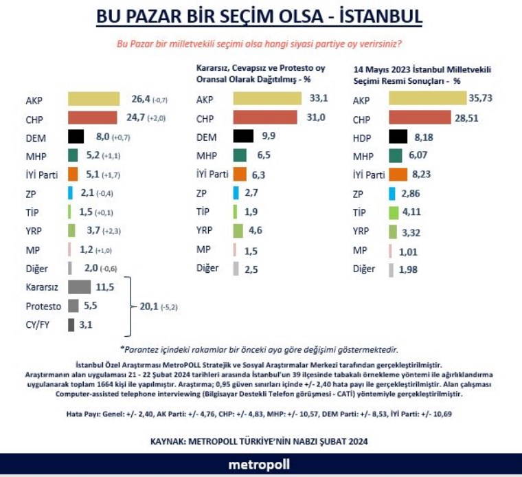 DEM Parti'nin 9.9 puana ulaştığı belirtilirken, MHP'nin puanı 6.5 oldu. Ankette İYİ Parti'nin puanı 6.3, Zafer Partisi'nin 2.7, Türkiye İşçi Partisi'nin 1.9, Yeniden Refah Partisi'nin 4.6 puanda olduğu görüldü.