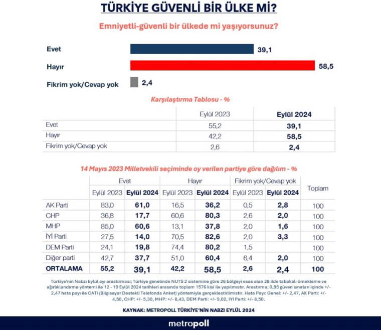 12-19 Eylül tarihleri arasında, 2,47 hata payı ile toplam bin 576 kişiyle yapılan ankete göre; yurttaşların yüzde 58,5'i "Türkiye güvenli bir ülke mi?" sorusuna "Hayır" yanıtını verdi.