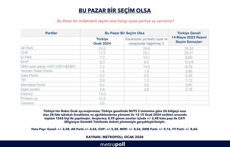 Siyaset gündeminin yerel seçime odaklandığı şu günlerde; MetroPOLL Araştırma Şirketi, Ocak 2024'te yaptığı Türkiye'nin Nabzı araştırmasının "Bu pazar bir seçim olsa" anketinin sonucunu paylaştı.