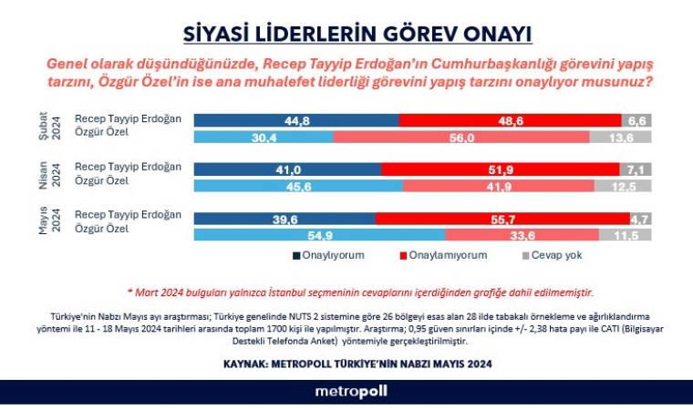 MetroPOLL Araştırma'nın Kurucusu ve Yöneticisi Özer Sencar, 'Siyasi Liderlerin Görev Onayı' başlıklı araştırmanın sonuçlarını paylaştı. Yapılan anket çalışmasında AKP'li Cumhurbaşkanı Recep Tayyip Erdoğan ve CHP Genel Başkanı Özgür Özel'e dair Mayıs ayında ölçümlenen kanaatler Şubat ve Nisan aylarındaki kanaatlerle karşılaştırmalı olarak ortaya konuldu.