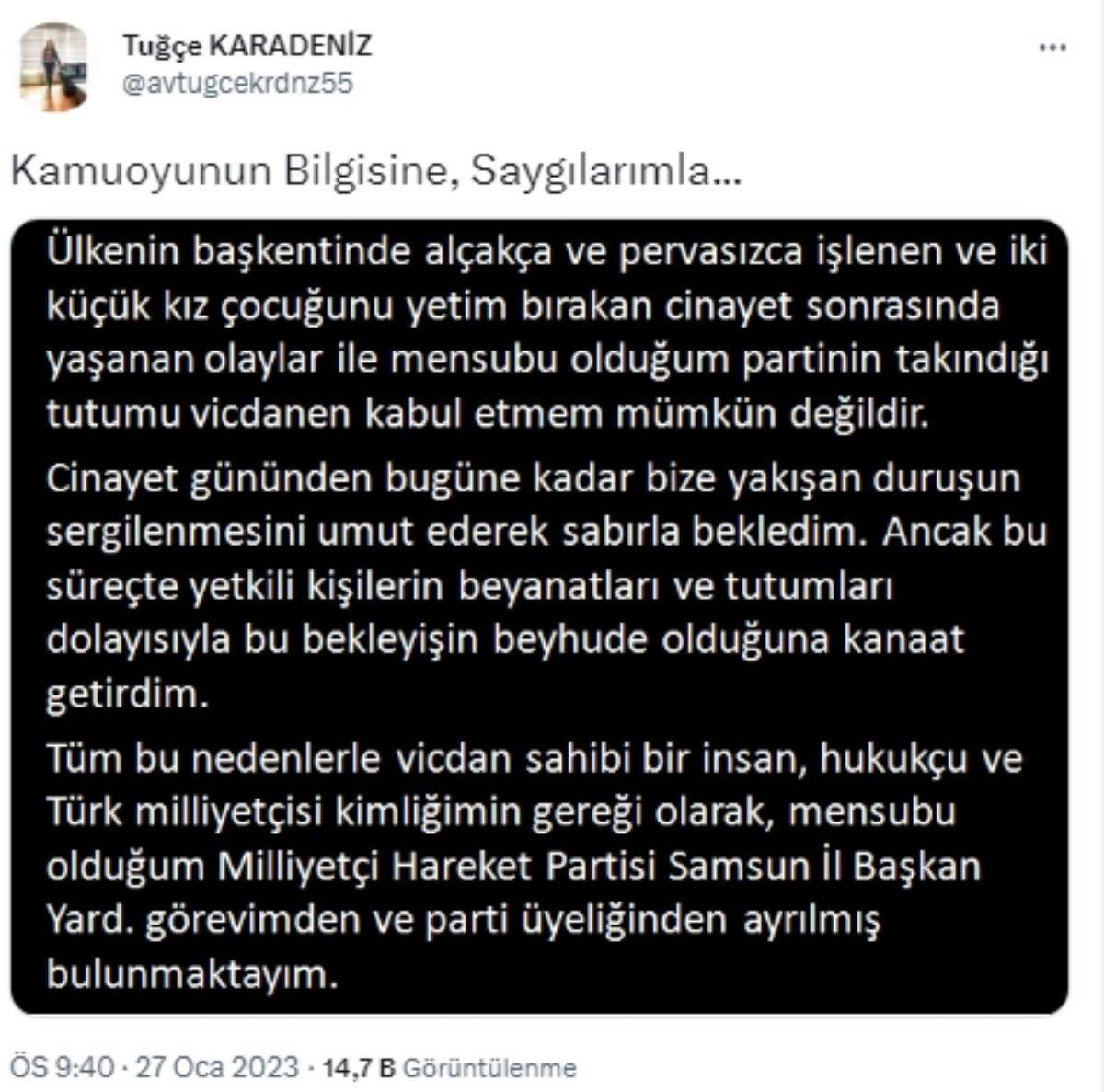 Parti yönetimine isyan ederek istifasını açıklayanlardan biri de MHP Samsun İl Başkan Yardımcısı Tuğçe Karadeniz oldu. Karadeniz, istifasını sosyal medya hesabından yaptığı açıklama ile duyurdu.