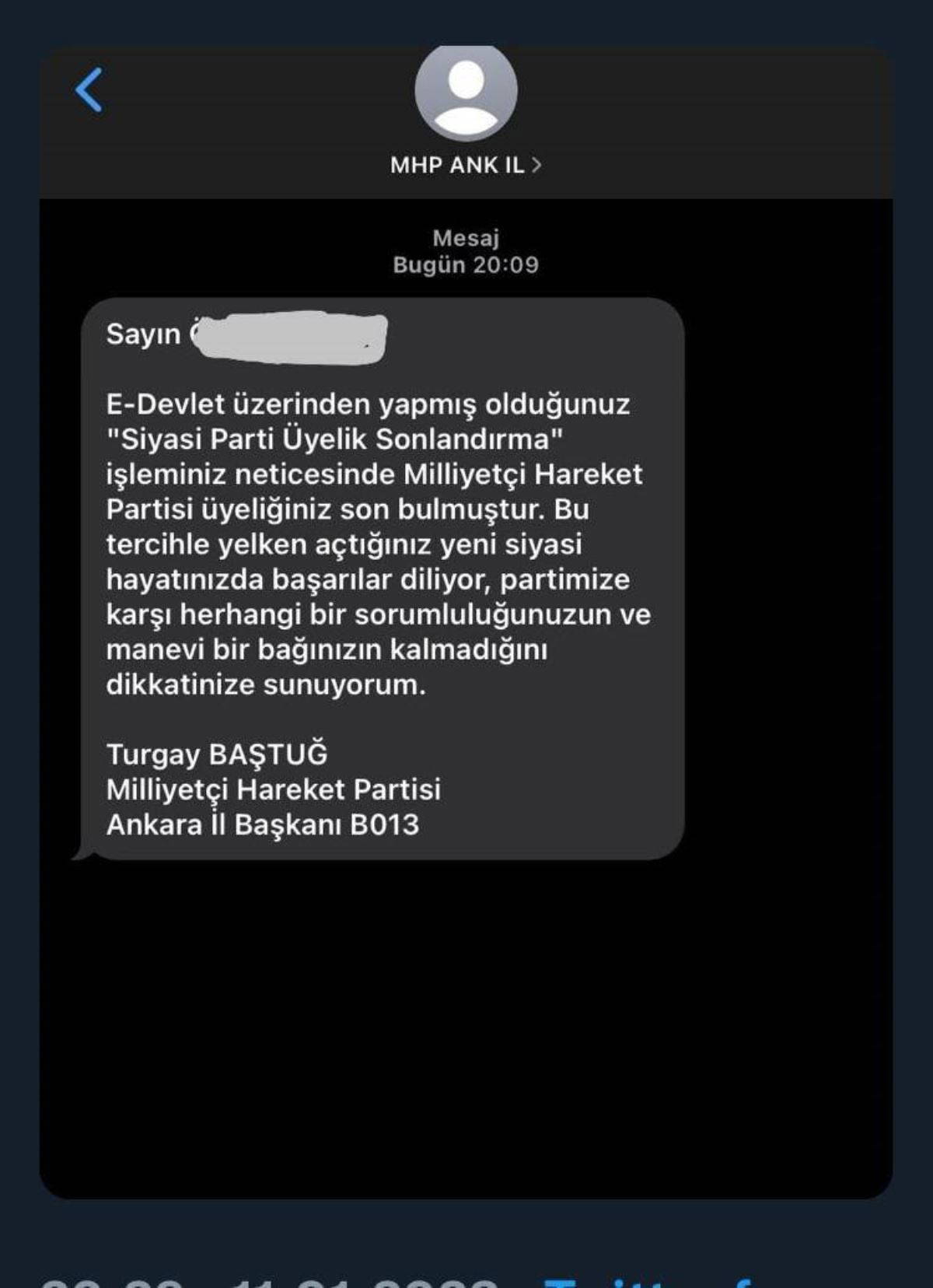 “E-Devlet üzerinden yapmış olduğunuz ‘Siyasi Parti Üyelik Sonlandırma’ işleminiz neticesinde Milliyetçi Hareket Partisi üyeliğiniz son bulmuştur. Bu tercihle yelken açtığınız yeni siyasi hayatınızda başarılar diliyor, partimize karşı herhangi bir sorumluluğunuzun ve manevi bir bağınızın kalmadığını dikkatinize sunuyorum."