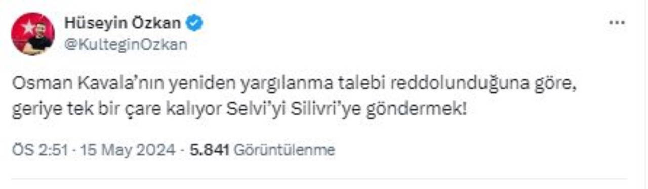 MHP Sosyal Medya Sorumlusu Hüseyin Özkan, sosyal medya hesabından yaptığı paylaşımda "Osman Kavala’nın yeniden yargılanma talebi reddolunduğuna göre, geriye tek bir çare kalıyor Selvi’yi Silivri’ye göndermek!" dedi.