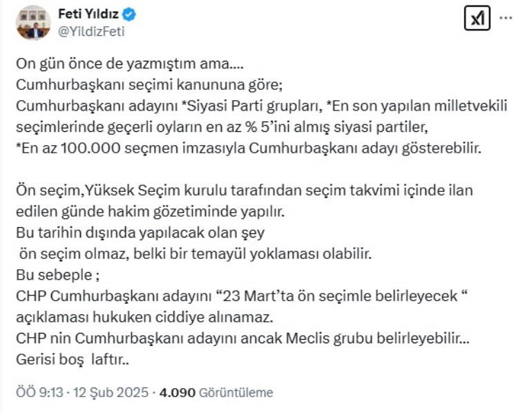 Feti Yıldız, sosyal medya platformu X'teki hesabı üzerinden yaptığı açıklamada, Cumhurbaşkanı Seçimi Kanunu’na göre cumhurbaşkanı adaylarının belirlenme yöntemlerini hatırlatarak şu ifadeleri kullandı: