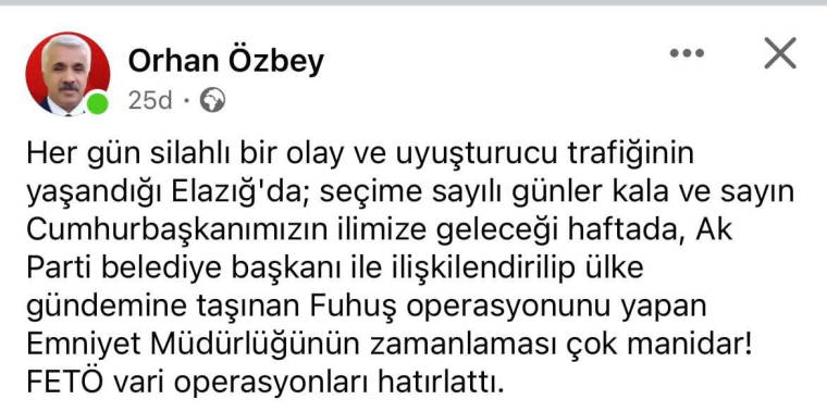 "Hergün silahlı bir olay ve uyuşturucu trafiğinin yaşandığı Elazığ’da; seçime sayılı günler kala ve sayın Cumhurbaşkanımızın ilimize geleceği haftada, Ak Parti belediye başkanı ile ilişkilendirilip ülke gündemine taşınan fuhuş operasyonunu yapan Emniyet Müdürlüğü’nün zamanlaması çok manidar! FETÖvari operasyonları hatırlattı."
