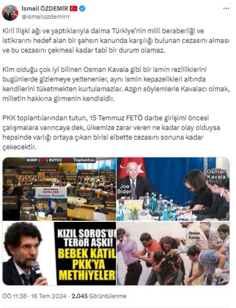 Açıklamada, Türkeş'in ismi verilmeden "Kim olduğu çok iyi bilinen Osman Kavala gibi bir ismin rezilliklerini bugünlerde gizlemeye yeltenenler, aynı ismin kepazelikleri altında kendilerini tüketmekten kurtulamazlar. Azgın söylemlerle Kavalacı olmak, milletin hakkına girmenin kendisidir" ifadeleri kullanıldı.