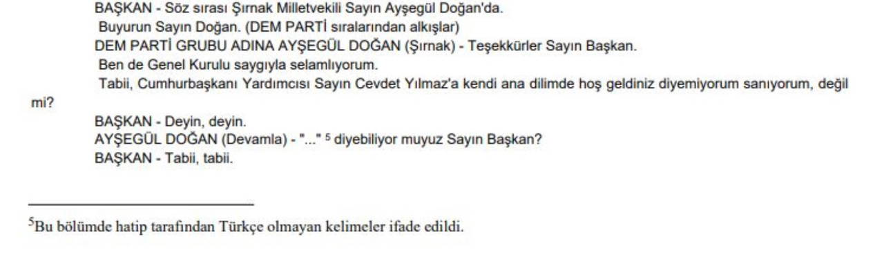 MHP'li Celal Adan'ın başkanlık ettiği oturumda, DEM Parti Şırnak Milletvekili Ayşegül Doğan konuşma yapmadan önce Adan’a yönelterek, "Cumhurbaşkanı Yardımcısı Sayın Cevdet Yılmaz'a kendi ana dilimde hoş geldiniz diyemiyorum sanırım, değil mi? 'Xun bi her hatin' diyebiliyor muyuz sayın başkan?" diye sordu.
