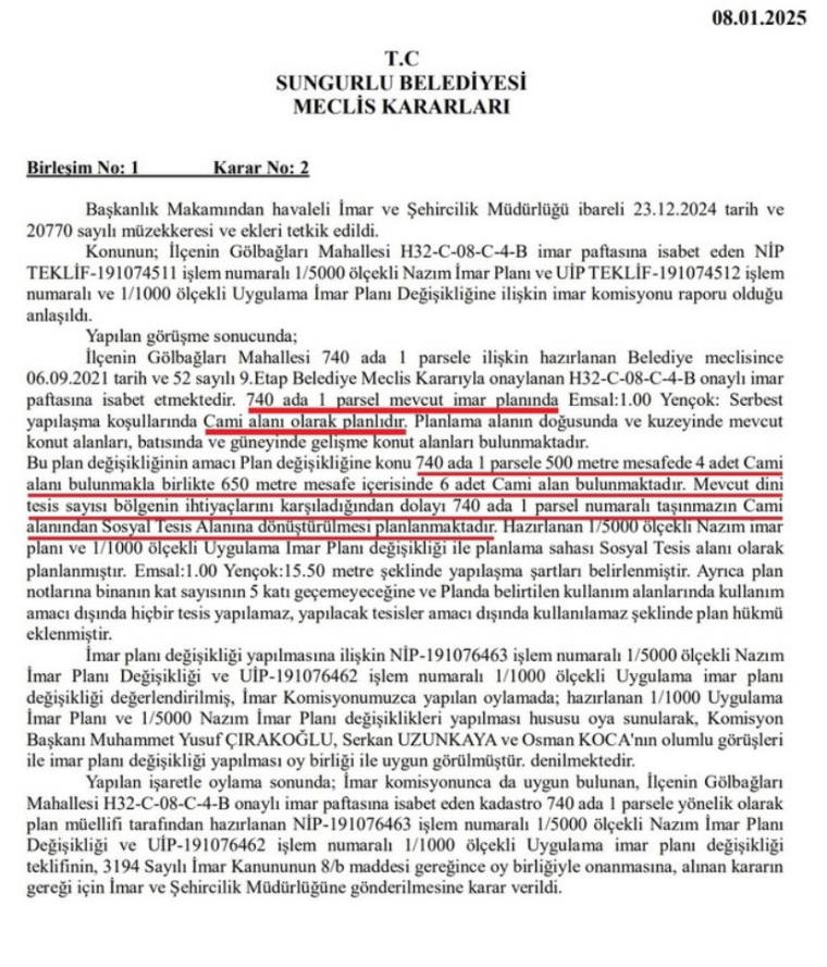 Sungurlu Belediye Meclisi’nin 8 Ocak 2025 tarihli olağan toplantısında, Başkan Muhsin Dere tarafından Meclise havale edilen, İmar ve Şehircilik Müdürlüğünün 23 Aralık 2024 tarihli plan değişikliği teklifi görüşüldü. Teklif, İYİ Partili önceki Belediye Başkanı Abdülkadir Şahiner zamanında hazırlanan ve 6 Eylül 2021 tarihinde Meclis kararı onaylanmış planlarda cami alanı olarak ayrılmış olan Gölbağları Mahallesi 740 ada 1 parselle ilgiliydi.