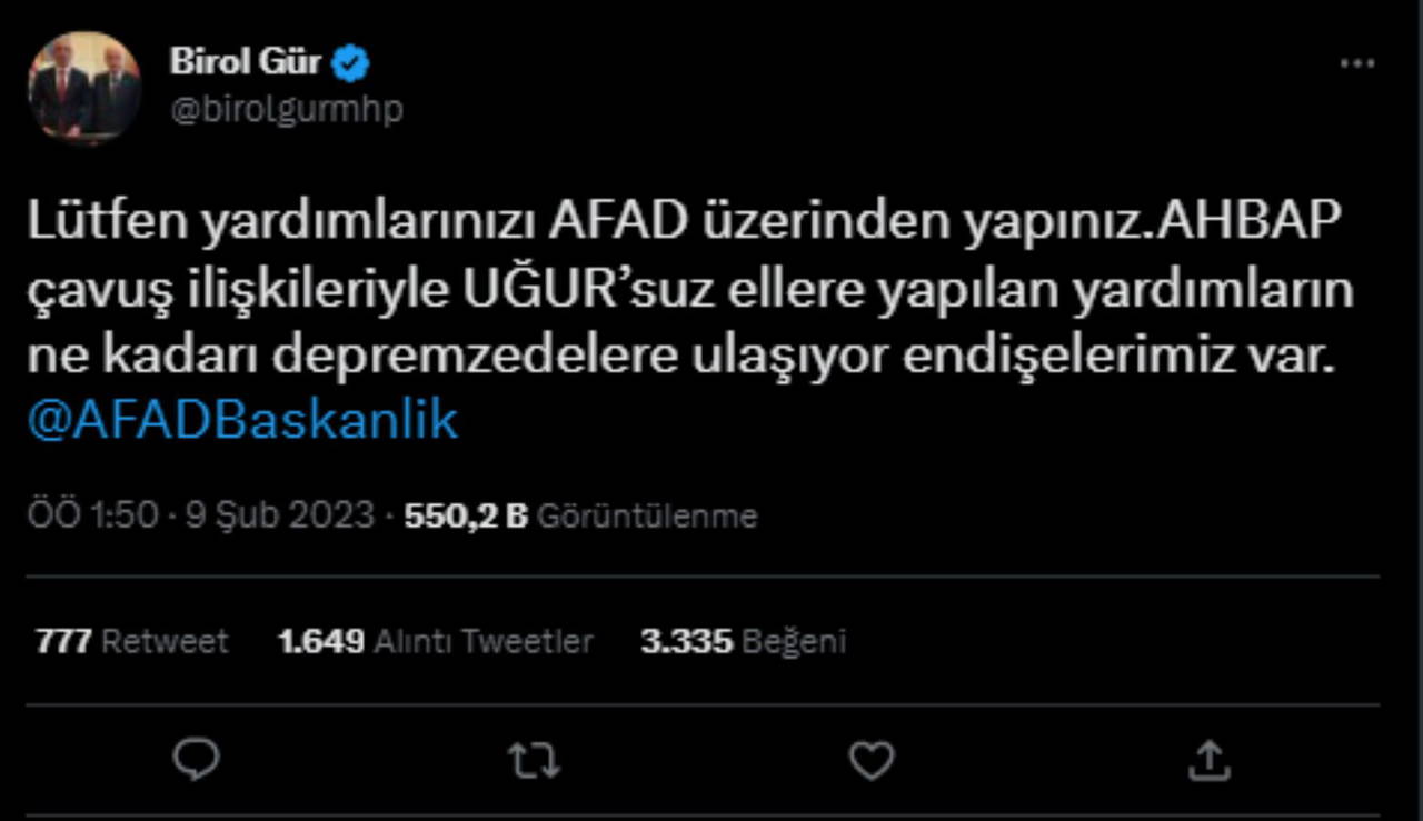 MHP İstanbul İl Başkanlığı görevinden geçen yıl aralık ayında istifa eden Birol Gür, sosyal medya hesabında yaptığı paylaşımla, ilk günden itibaren deprem felaketi mağdurlarına yönelik yardım faaliyetlerini sürdüren Haluk Levent’in kurucusu olduğu AHBAP Derneği ve Babala TV kurucusu Oğuzhan Uğur’u hedef aldı.