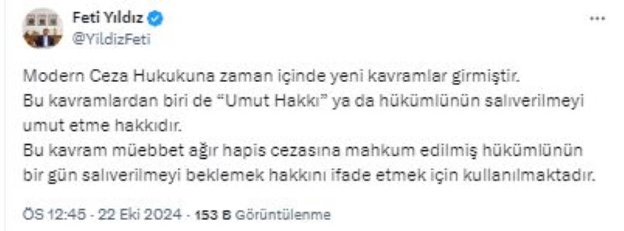 Feti Yıldız, Bahçeli'nin çıkışına binaen bir diğer paylaşımında ise MHP liderinin 'Umut Hakkı' hatırlatmasına işaret edip "Modern Ceza Hukukuna zaman içinde yeni kavramlar girmiştir. Bu kavramlardan biri de 'Umut Hakkı' ya da hükümlünün salıverilmeyi umut etme hakkıdır. Bu kavram müebbet ağır hapis cezasına mahkum edilmiş hükümlünün bir gün salıverilmeyi beklemek hakkını ifade etmek için kullanılmaktadır" dedi.