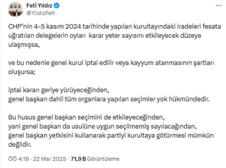 Yıldız, X hesabından yaptığı paylaşımda, "CHP kurultayına yönelik soruşturma kapsamında iptal şartlarının geriye dönük olacağından kurultay seçiminin de yok hükmünde olacağını" savundu.