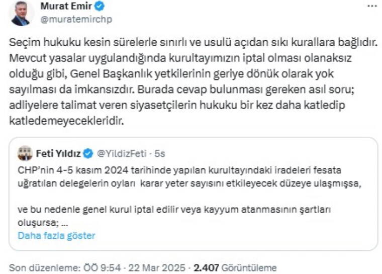 MHP'li Feti Yıldız'ın bu çıkışına CHP yönetiminden yanıt geldi. CHP Grup Başkanvekili Murat Emir "Seçim hukuku kesin sürelerle sınırlı ve usulü açıdan sıkı kurallara bağlıdır. Mevcut yasalar uygulandığında kurultayımızın iptal olması olanaksız olduğu gibi, Genel Başkanlık yetkilerinin geriye dönük olarak yok sayılması da imkansızdır. Burada cevap bulunması gereken asıl soru; adliyelere talimat veren siyasetçilerin hukuku bir kez daha katledip katledemeyecekleridir" ifadeleriyle yanıt verdi.