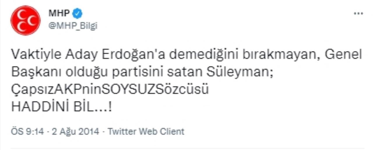 Söz konusu paylaşımda Soylu'nun geçmişte AKP ve AKP'li Cumhurbaşkanı Recep Tayyip Erdoğan aleyhindeki sözlerine gönderme yapılarak "Vaktiyle aday Erdoğan'a demediğini bırakmayan, Genel Başkanı olduğu partisini satan Süleyman; Çapsız AKP'nin Soysuz Sözcüsü Haddini bil...!" ifadeleri kullanılmıştı.