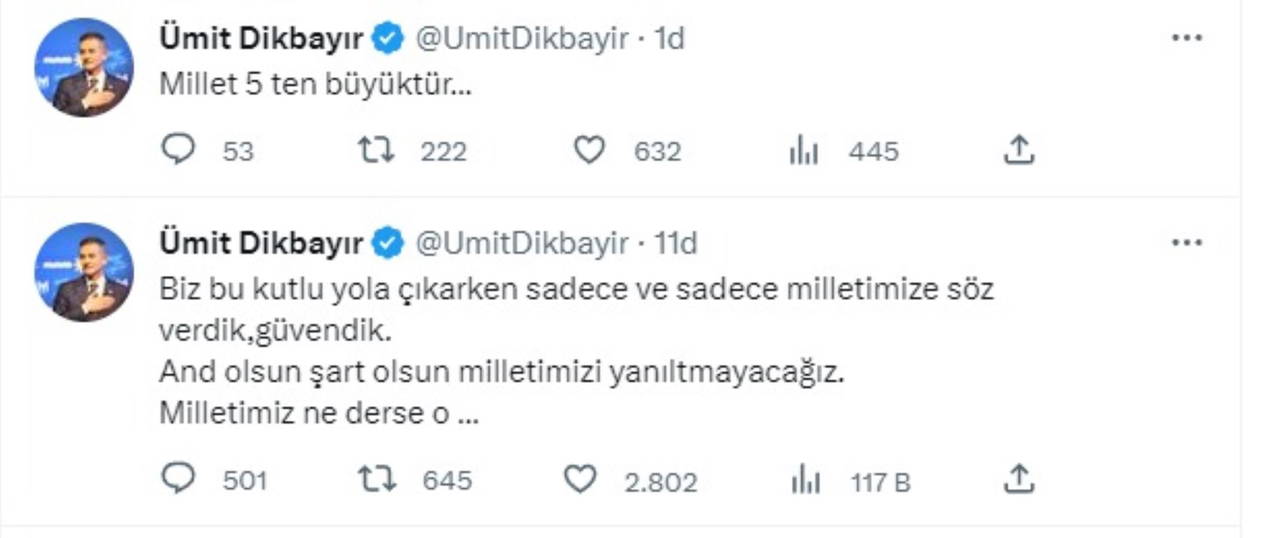 Genel Başkan Yardımcısı Ümit Dikbayır, “Millet 5’ten büyüktür” paylaşımı yapıp daha sonra tweet'i silmişti.