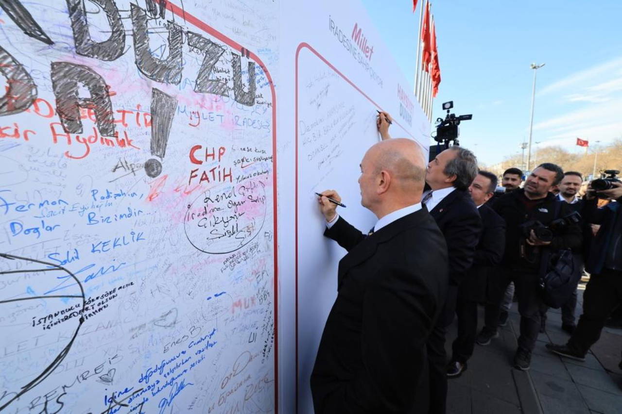 İmamoğlu’nu ziyaret eden başkanlar, İBB yerleşkesinin önündeki “Haysiyet Duvarı”na imza attı.