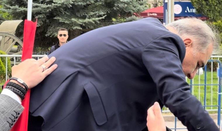 Alana gireceği noktayı şaşırınca yurttaşlar için ayrılan alanda güvenlik için polis tarafından kurulan bariyerlerin üzerine çıkıp ardından kaldırıma atlayan Arabacı’ya danışmanları yardım etti.