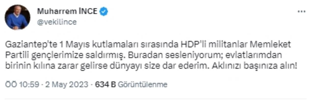 "Gaziantep'te 1 Mayıs kutlamaları sırasında HDP'li militanlar Memleket Partili gençlerimize saldırmış. Buradan sesleniyorum; evlatlarımdan birinin kılına zarar gelirse dünyayı size dar ederim. Aklınızı başınıza alın!"