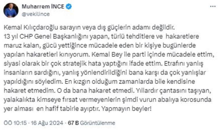 Sosyal medya platformu X'teki hesabı üzerinden bir açıklama yapan İnce, "Kemal Kılıçdaroğlu sarayın veya dış güçlerin adamı değildir" başlıklı açıklamasında şu ifadeleri kullandı: