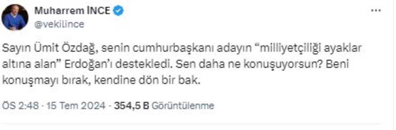 “Sayın Ümit Özdağ, senin cumhurbaşkanı adayın “milliyetçiliği ayaklar altına alan” Erdoğan’ı destekledi. Sen daha ne konuşuyorsun? Beni konuşmayı bırak, kendine dön bir bak.”