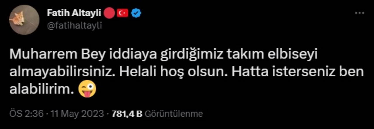 Daha önce Muharrem İnce ile 'takım elbisesine' iddiaya girdiklerini anlatan Altaylı, Twitter'dan yaptığı paylaşımda, "Muharrem Bey iddiaya girdiğimiz takım elbiseyi almayabilirsiniz. Helali hoş olsun. Hatta isterseniz ben alabilirim" dedi.