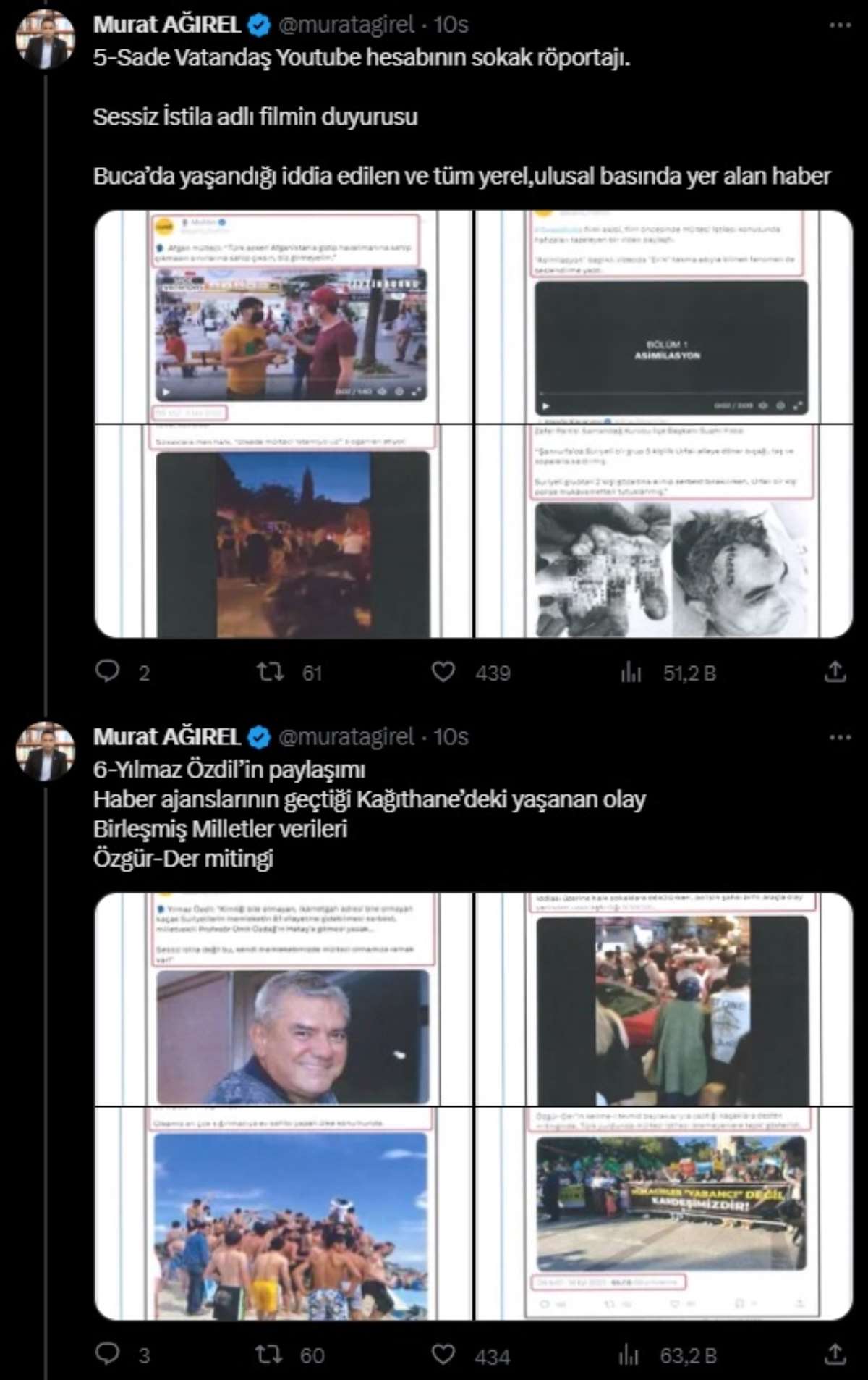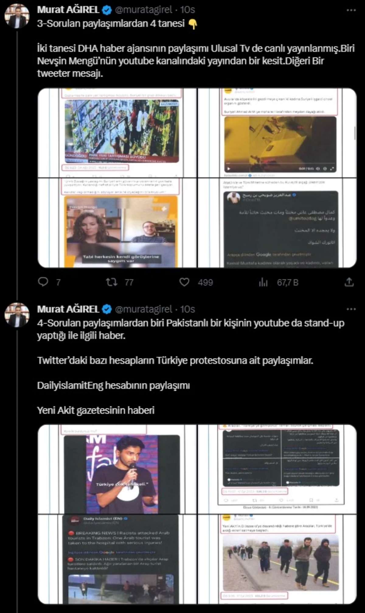 Sorulan paylaşımlardan arasında Pakistanlı bir kişinin YouTube'da yaptığı stand-up ilgili haber, Twitter’daki bazı hesapların Türkiye protestosuna ait paylaşımlar, Yeni Akit gazetesinin haberi, Sade Vatandaş Youtube hesabının sokak röportajı gibi paylaşımlar yer aldığı aldığını söyleyen Ağırel, şöyle yazdı: