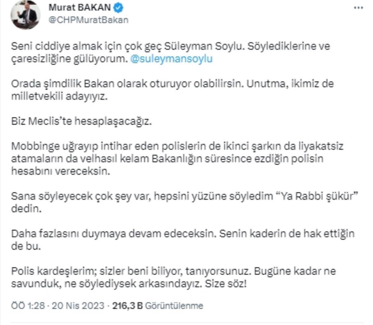 İçişleri Bakanı Süleyman Soylu, dün katıldığı canlı yayın programında CHP İzmir Milletvekili Murat Bakan'la ilgili olarak, "Emniyet içerisinde paralel bir yapı kurmaya çalışan bir anlayışın kendisidir. FETÖ'nün ikinci paralel yapısını oluşturmaya çalışıyor. Bütün sistem elimizdedir. Bütün sistem de yargıya intikal ettirilecektir. Son çerçevesini çiziyoruz" demişti.