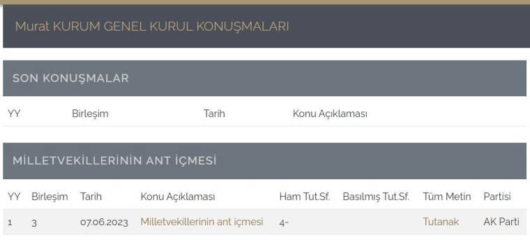 Kurum, 28. Dönem Milletvekili olarak Meclis Genel Kurul konuşmasını sadece "ant içme" töreni sırasında yaptığı belirlendi.
