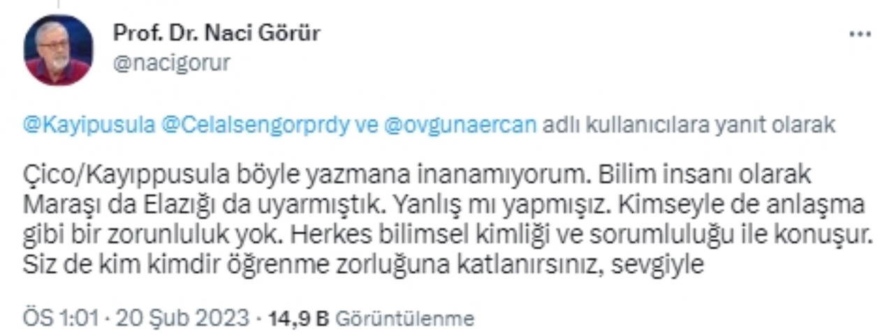 İlgili kullanıcının 'isyan'ına Prof. Dr. Naci Görür'den yanıt geldi. Görür, yanıtında "Böyle yazmana inanamıyorum. Bilim insanı olarak Maraşı da Elazığı da uyarmıştık. Yanlış mı yapmışız. Kimseyle de anlaşma gibi bir zorunluluk yok. Herkes bilimsel kimliği ve sorumluluğu ile konuşur. Siz de kim kimdir öğrenme zorluğuna katlanırsınız, sevgiyle" ifadelerini kullandı.