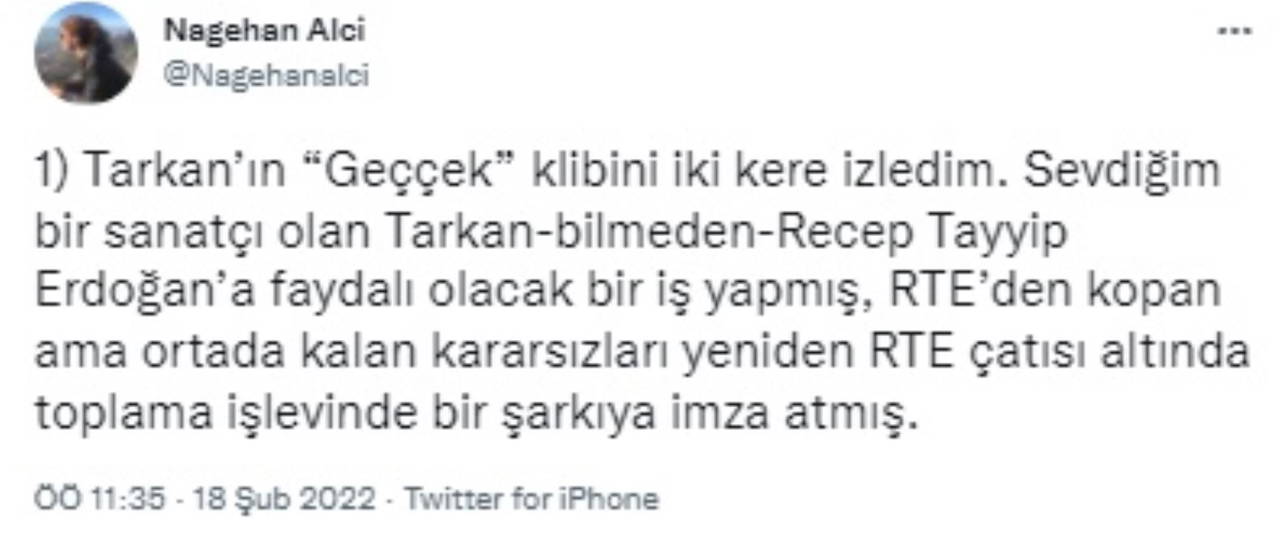 Birçok kesimden farklı tepkiler alan şarkıyla ilgili Habertürk yazarı Nagehan Alçı da Twitter üzerinden bir yorumda bulundu.