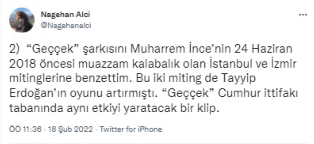 "Tarkan’ın “Geççek” klibini iki kere izledim. Sevdiğim bir sanatçı olan Tarkan-bilmeden-Recep Tayyip Erdoğan’a faydalı olacak bir iş yapmış, RTE’den kopan ama ortada kalan kararsızları yeniden RTE çatısı altında toplama işlevinde bir şarkıya imza atmış" diyen Alçı, "“Geççek” şarkısını Muharrem İnce’nin 24 Haziran 2018 öncesi muazzam kalabalık olan İstanbul ve İzmir mitinglerine benzettim. Bu iki miting de Tayyip Erdoğan’ın oyunu artırmıştı. “Geççek” Cumhur ittifakı tabanında aynı etkiyi yaratacak bir klip" iddiasında bulundu.