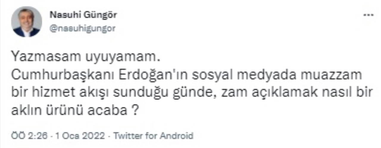 Twitter hesabından "Yazmasam uyuyamam" diyen Nasuhi Güngör, AKP'li Cumhurbaşkanı Recep Tayyip Erdoğan'ın 2021 yılında gerçekleştirilen faaliyet ve icraatlere yönelik gün boyunca sosyal medya hesabı üzerinden yaptığı görsel paylaşımları hatırlatıp "Cumhurbaşkanı Erdoğan'ın sosyal medyada muazzam bir hizmet akışı sunduğu günde, zam açıklamak nasıl bir aklın ürünü acaba?" diye sordu.