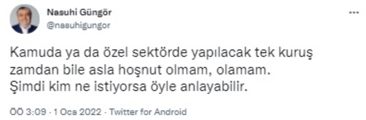 Güngör, paylaşımı üzerine gelen tepkilere de "Kamuda ya da özel sektörde yapılacak tek kuruş zamdan bile asla hoşnut olmam, olamam. Şimdi kim ne istiyorsa öyle anlayabilir" diye yanıt verdi.