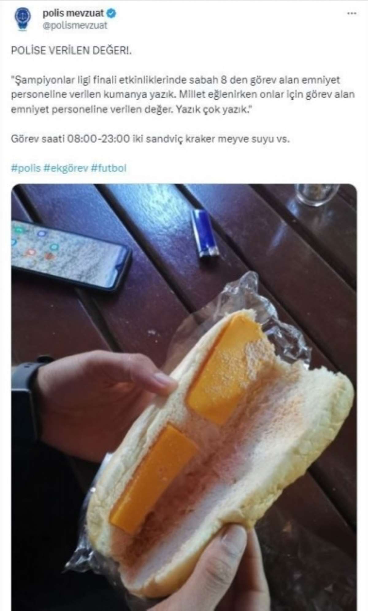 Twitter'da "Polis mevzuat" adlı bir hesap, polislere verilen kumanyayı, “Polise verilen değer! Şampiyonlar ligi finali etkinliklerinde sabah 8’den görev alan emniyet personeline verilen kumanya yazık. Millet eğlenirken onlar için görev alan emniyet personeline verilen değer. Yazık çok yazık. Görev saati 08:00-23:00 iki sandviç kraker meyve suyu vs.” notuyla paylaşmıştı.