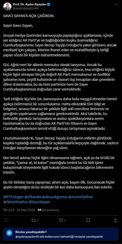 Sayan'a çağrıda bulunan Ayaydın da, ismi açıklamasını istedi,