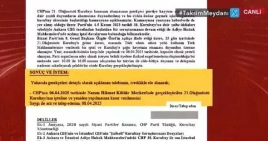 "Olağanüstü kongrelerde itiraz için 48 saatlik süre vardır. Bu sürede YSK'ya yapılan başvurunun ciddi gerekçelere dayandığı iddia ediliyor. CHP'li akademisyen Kemal Çiftçi, 48 saat içinde olağanüstü kongrenin iptali için dilekçe verdi. Dilekçede 'kanuna karşı hile yapıldı, antidemokratik şekilde oldu bittiye getirildi, fiziksel engellemelerle aday olamadık' deniyor. Aynı zamanda seçme ve seçilme hakkımı elimizden alındı denilerek, kayyım atanacak diye kanuna karşı hile yapıldığı belirtiliyor. Her şeyden öte Berhan Şimşek'in nasıl aday yapılmadığı da dilekçede yer alıyor."