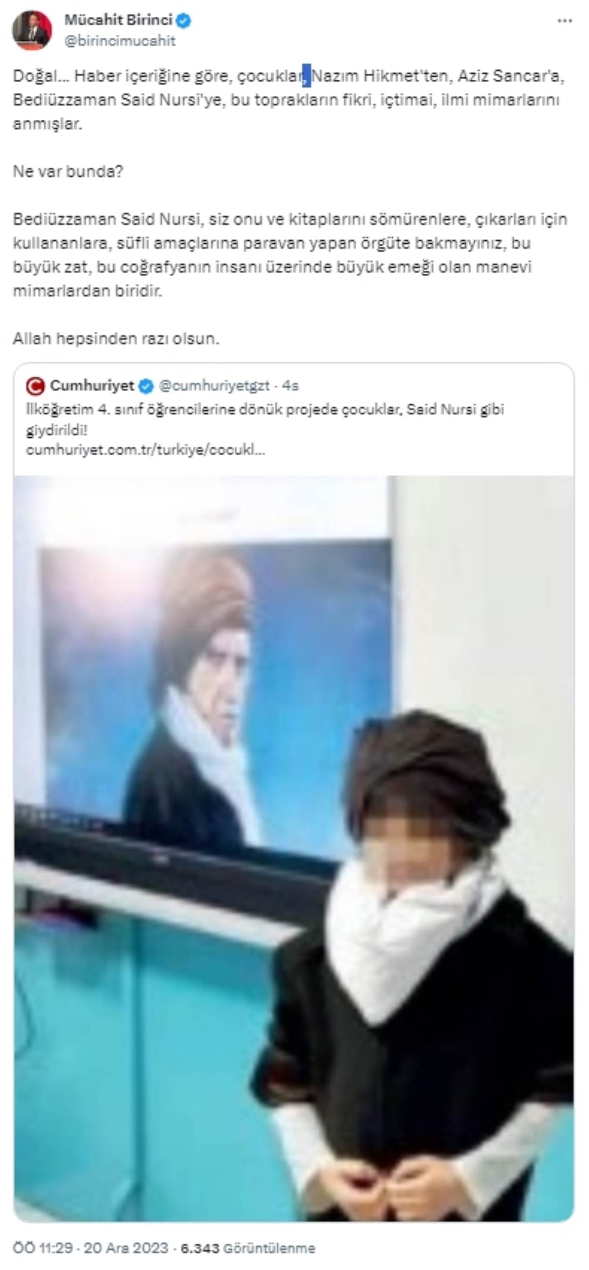 AKP'nin eski MKYK üyelerinden Mücahit Birinci, sosyal medya platformu X üzerinden haberimizi alıntılayarak yaptığı açıklamasında "Doğal... Haber içeriğine göre, çocuklar, Nazım Hikmet'ten, Aziz Sancar'a, Bediüzzaman Said Nursi'ye, bu toprakların fikri, içtimai, ilmi mimarlarını anmışlar" dedi.