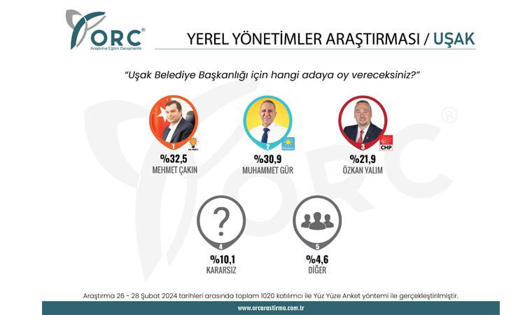 Uşak’ta yapılan yerel yönetimler araştırmasında seçmenlere, "Belediye Başkanlığı için hangi adaya oy vereceksiniz?" sorusu yöneltildi.