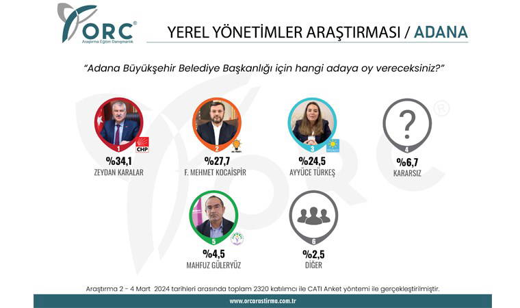 Adana’da yaşayan seçmenlere, "Büyükşehir Belediye Başkanlığı için hangi adaya oy vereceksiniz?" sorusu yöneltildi.