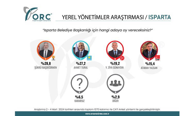 Yüzde 28,8 AKP’li Şükrü Başdeğirmen dedi. Onu hemen ardından İYİ Partili Ahmet Tural yüzde 27,2 ile takip etti. Yüzde 19,2 MHP’li Ziya Günaydın, yüzde 15,4 CHP’li Atakan Yazgan dedi. Kararsızların oranı yüzde 6,5 olurken, diğer adaylara oy vereceğini söyleyenlerin oranı da yüzde 2,9 oldu.