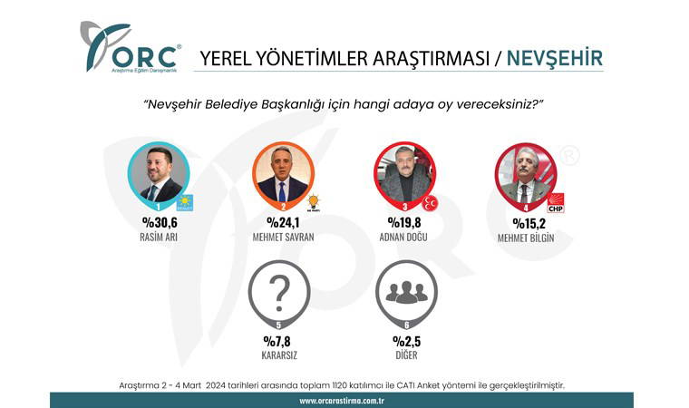 Yüzde 30,6 ile İyi Parti’nin adayı Rasim Arı önde olurken, onu yüzde 24,1 ile AKP’nin adayı Mehmet Savran takip etti. Yüzde 19,8 MHP’li Adnan Doğu, yüzde 15,2 CHP’li Mehmet Bilgin dedi. Yüzde 7,8 kararsız olduğunu söylerken, diğer adaylara oy vereceklerin oranı yüzde 2,5 oldu.