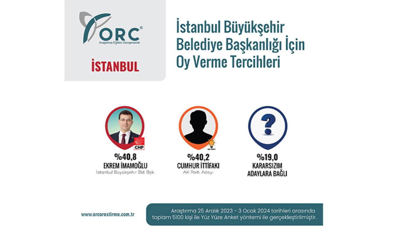 Anket şirketleri de araştırmalarını İstanbul'daki seçim üzerine yoğunlaştırdı. ORC Araştırma İstanbullulara belediye başkanlığı için kime oy vereceklerini sordu. Ancak Cumhur İttifakı'nın adayı belli olmadığı için soru 'AKP adayı' şeklinde yöneltildi.