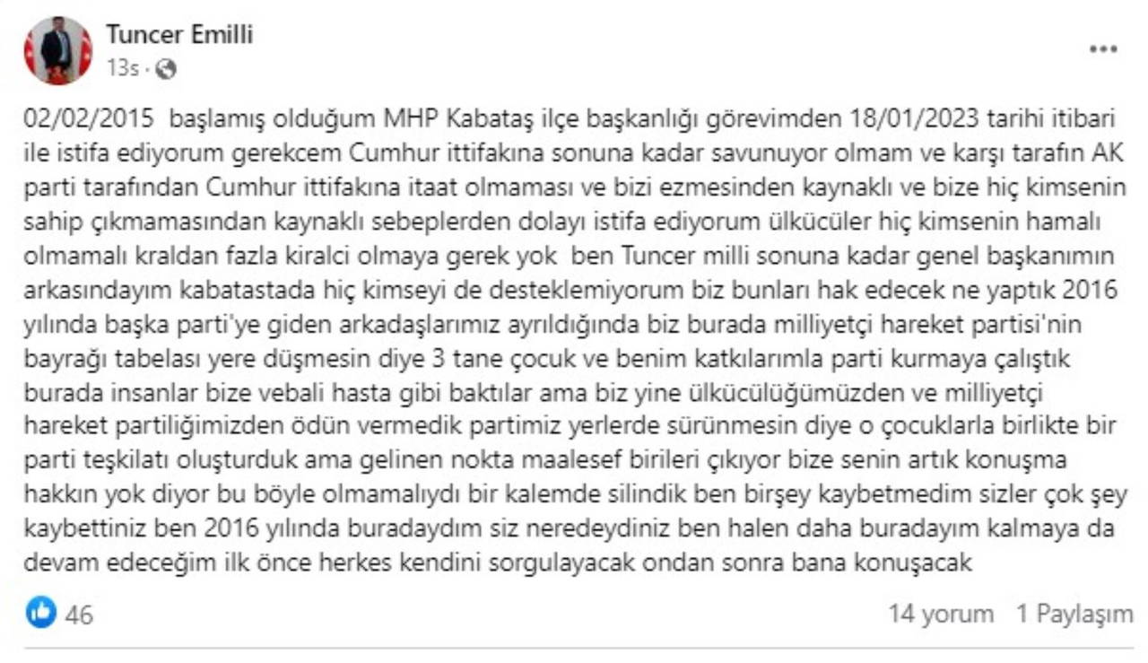 Ordu’da MHP Kabataş İlçe Başkanı Tuncer Emilli, 2015 yılında başladığı görevinden istifa etti. İstifasını sosyal medya hesabından duyuran Emilli, dikkat çekici ifadeler kullandı. Cumhur İttifakı'nı sonuna kadar savunduğunu belirten Emilli istifa gerekçesinde, ittifak ortakları AKP'nin kendilerini "ezdiğini" belirtti.